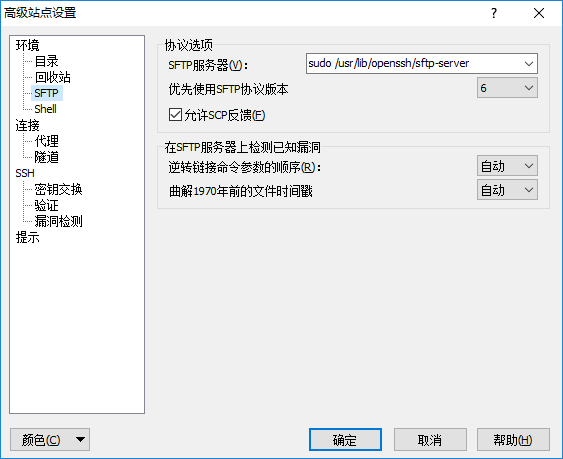 在sftp服[]务器一栏中填[]入:sudo[]/usr/l[]ib/ope[]nssh/s[]ftp-se[]rver