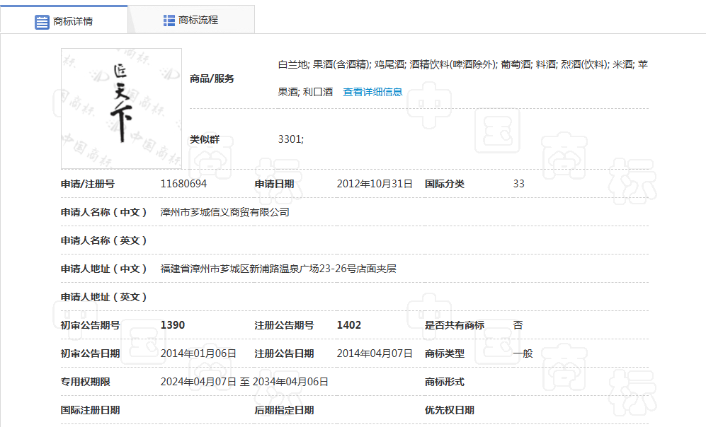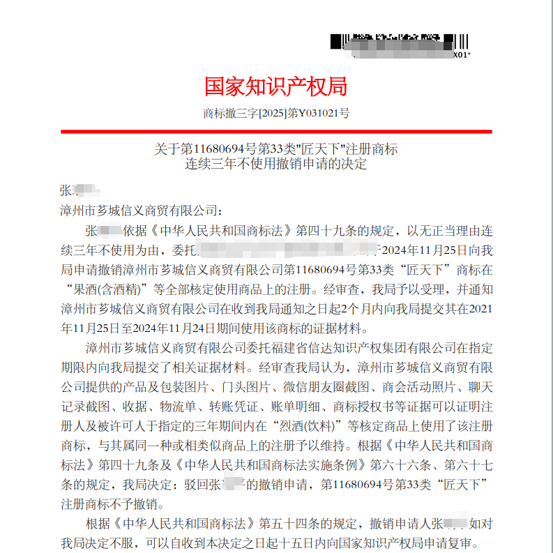 漳州市芗城信义商贸有限公司所持有的第33类“匠天下”商标(申请号11680694 ),涵盖白兰地、果酒、鸡尾酒等酒饮商品,在市场耕耘中积累了品牌价值。2024年,因他人以“连续三年不使用”为由申请撤三,商标存续面临严峻考验。若撤销成立,企业多年积累的品牌资产将付诸东流,市场布局也会遭受重创。
