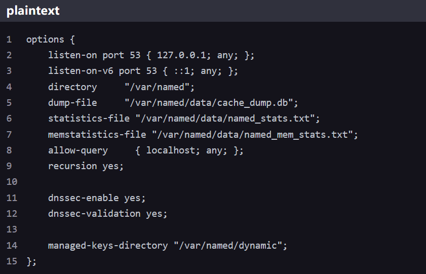 Bind的主配置文件通常位于/etc/named.conf。打开该文件进行编辑: