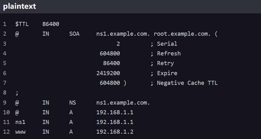 @符号代表区域名(即example.com),NS记录指定了DNS服务器的名称,A记录将域名映射到IP地址。