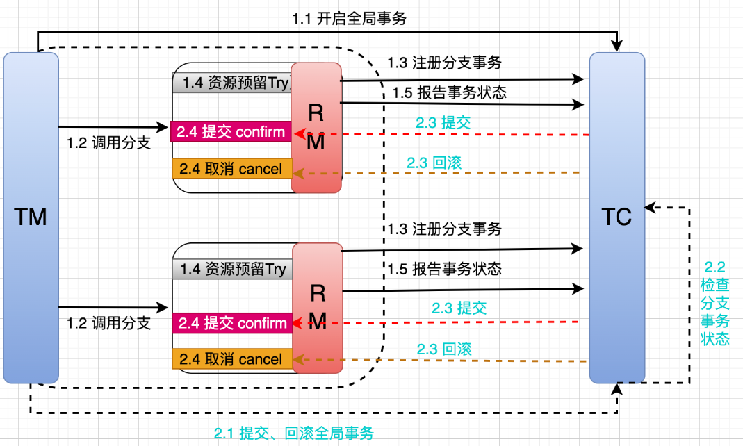 所谓的 TCC 编程模式,也是两阶段提交的一个变种,不同的是 TCC 为在业务层编写代码实现的两阶段提交。TCC 分别指 Try、Confirm、Cancel ,一个业务操作要对应的写这三个方法。