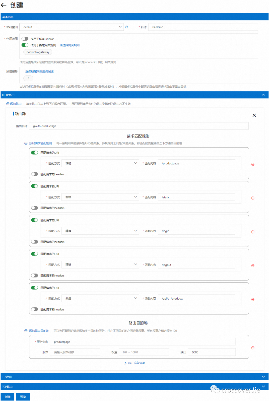 之后就可以配置路由规则将流量分别指定到两个不同的组中,这里我们使用 VirtualService 进行配置。