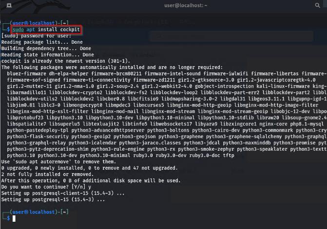 图 3.执行sudo apt install cockpit命令安装 Cockpit。