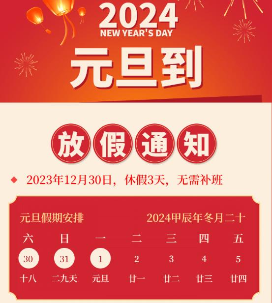 2023年12月30日(周六)-2024年1月1日(周一)放假,共3天。1月2日(周二)正常上班。